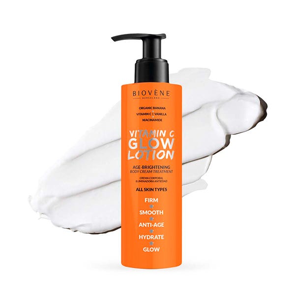 Potente tratamiento de loción corporal hidro-brillo con vitamina C antienvejecimiento y plátano orgánico que se absorbe rápidamente para ayudar a hidratar la piel seca y recuperar su verdadera luminosidad mientras nutre una textura de piel firme, suave y flexible.