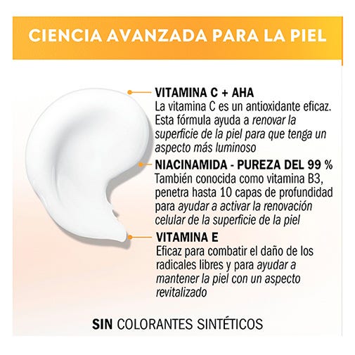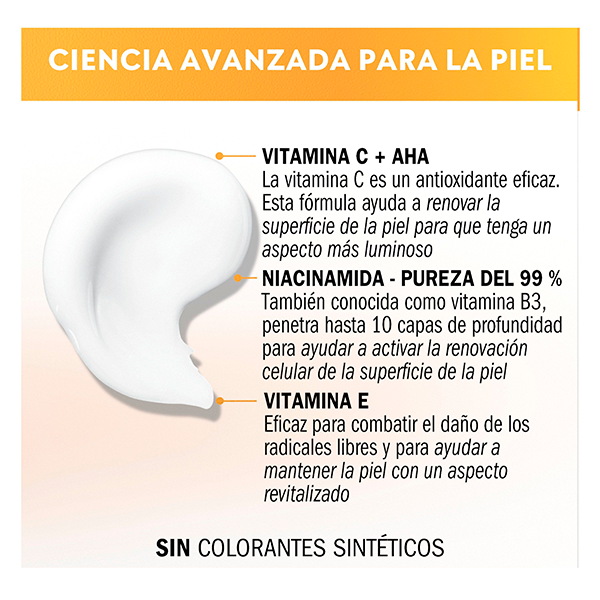 Nuestra fórmula, con potentes ingredientes como la Vitamina C, el AHA y la Niacinamida, puede atenuar el aspecto apagado de la piel (como las células muertas) y mejorar su tono desigual, mostrando toda su luminosidad.