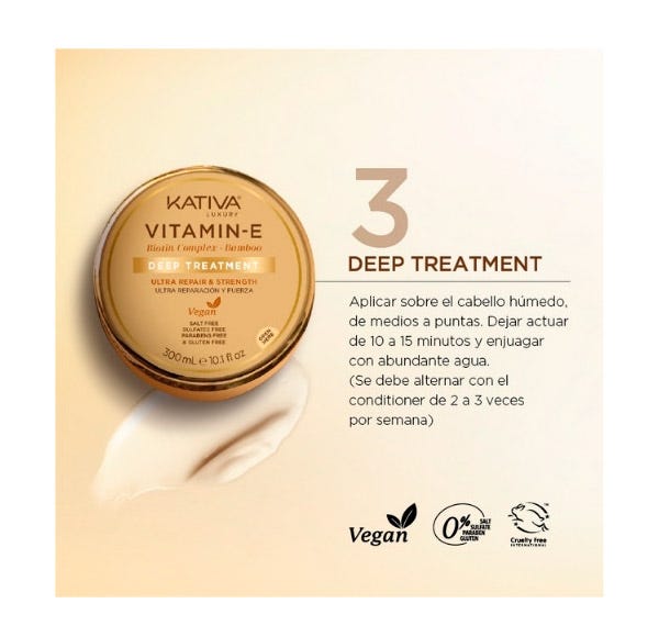 Para lograr mejores resultados, recomendamos usar toda la línea de productos Kativa Vitamina E, Complejo de Biotina y Bambú.