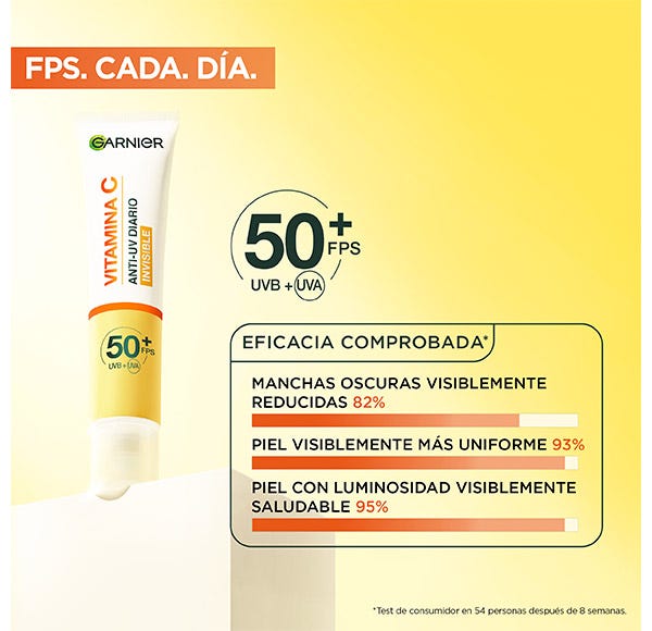 Fluido UV Diario Iluminador Invisible con SPF50+ para proteger, prevenir y reducir las manchas oscuras de tu rostro. Diseñado para transformar tu rutina de cuidado de la piel, este fluido tiene eficacia proabada. -53% las manchas oscuras*, +43% pie illuminada y + 40% piel uniforme.