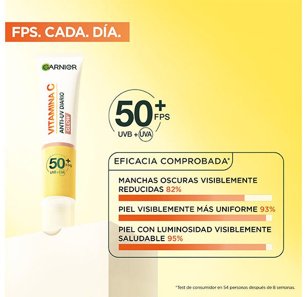 Fluido UV Diario Iluminador con SPF50+ para proteger, prevenir y reducir las manchas oscuras de tu rostro dejando un efecto glow en la piel. Diseñado para transformar tu rutina de cuidado de la piel y combatir las manchas oscuras. Eficácia Probada. Este producto con acabado glow, no solo protege tu piel contra los daños del sol con SPF50+, sino que también combate activamente las manchas oscuras.