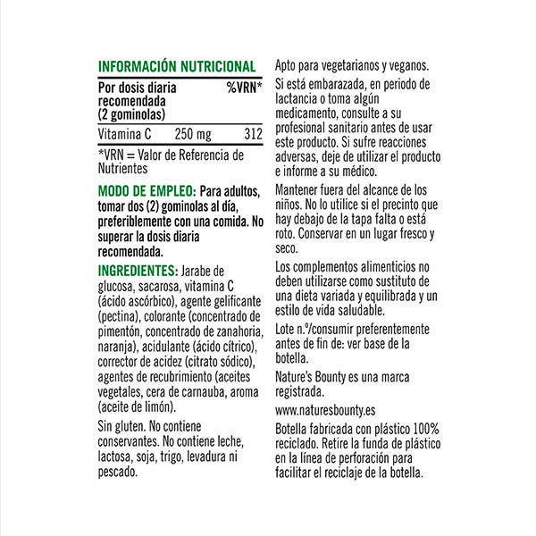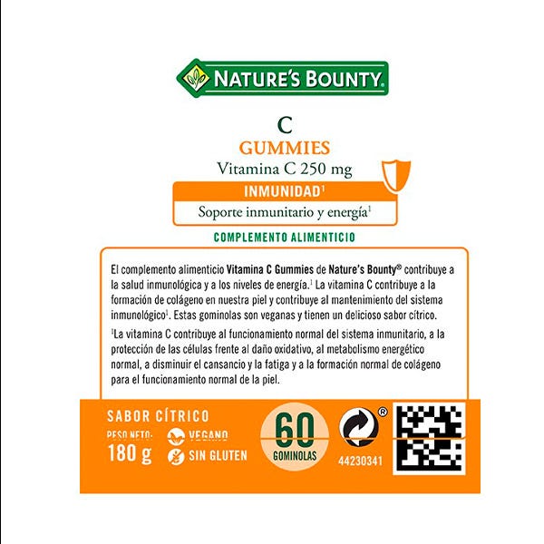 El complemento alimenticio Vitamina C gummies de Nature´s Bounty® contribuye al apoyo inmunológico (1) y a los niveles de energía (2). La vitamina C contribuye a la formación de colágeno en nuestra piel (3). Presentado en gominolas veganas tienen delicioso sabor cítrico. La vitamina C contribuye a la protección de las células del daño oxidativo (4), al metabolismo energético normal (2) y a reducir el cansancio y la fatiga (5).