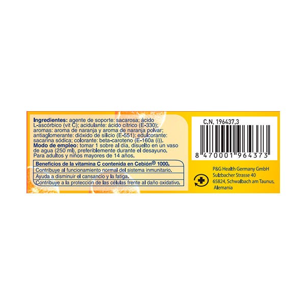 Agente de soporte: sacarosa, ácido L-ascórbico (vitamina C), acidulante: ácido cítrico (E-330), aromas: aroma de naranja y aroma de naranja polvar, antiaglomerante: dióxido de silicio (E-551), edulcorante: sacarina sódica, colorante: beta-caroteno (E-160a (i)).