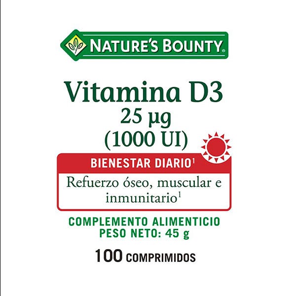 El complemento alimenticio Vitamina D3 25 Mg de Nature’s Bounty® contiene vitamina D, en la misma forma que la que se produce de forma natural en el cuerpo, como resultado de la exposición a la luz solar.