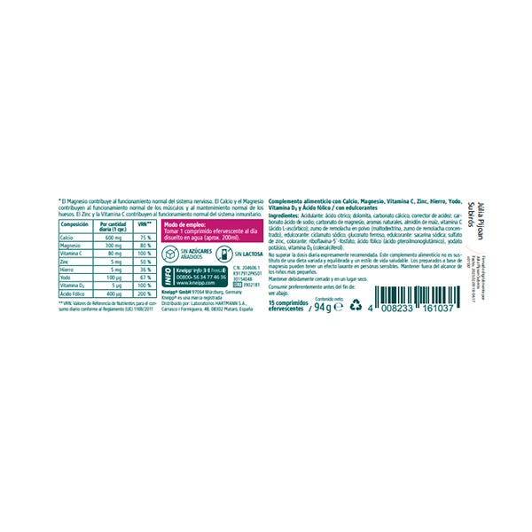 Sin gluten, sin lactosa, sin azúcares añadidos, apto para vegetarianos. Contenido: 15 Comprimidos efervescentes.