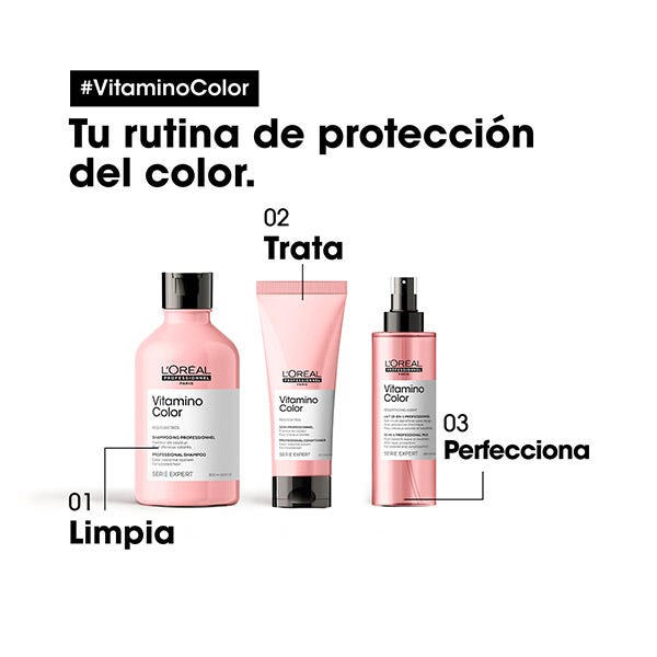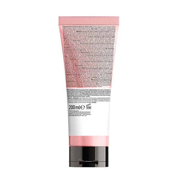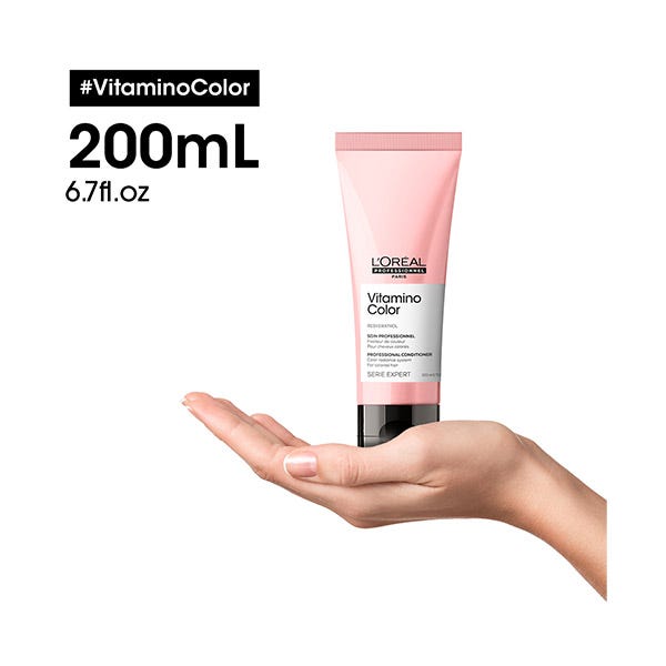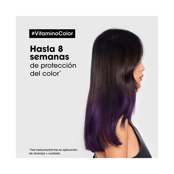 Acondicionador Vitamino Color para cabello coloreado. Facilita el desenredo y deja el cabello más suave. Se utiliza después del champú Vitamino Color, aportando tonos vibrantes, un brillo inifnito y suavizando el cabello. Protege el color hasta 8 semanas*. El cabello es más resistente, hidratado. Más fácil de desenredar y más suave