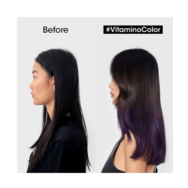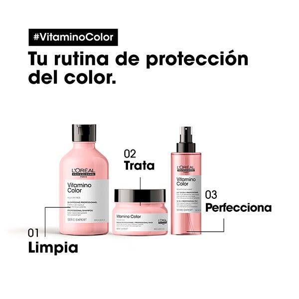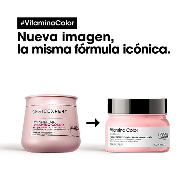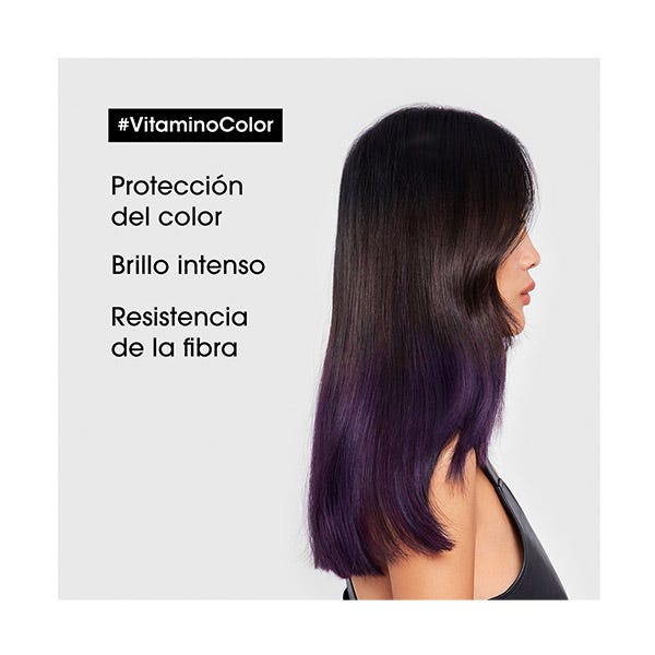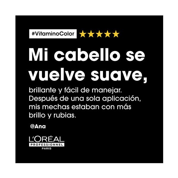 Mascarilla Vitamino Color para cabello coloreado, repara las partes dañadas del cabello coloreado, en envolviéndolas en una película ligera que lo protege del desgaste cotidiano. 5 veces más brillo después de la aplicación. 48h de brillo.