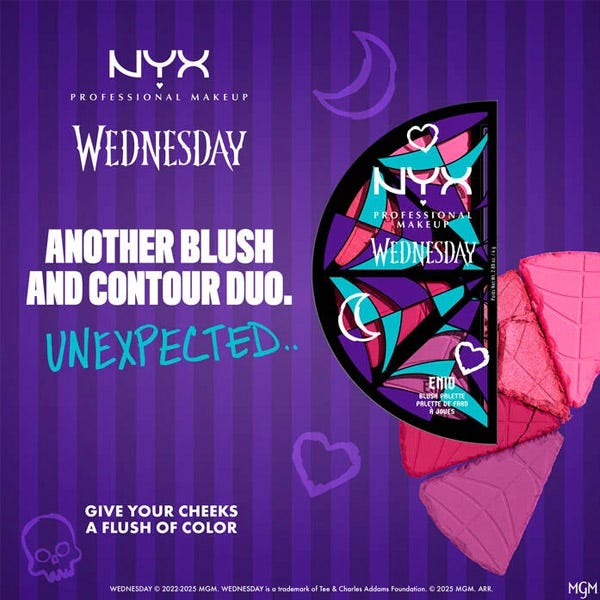 Con tonos tan cautivadores y misteriosos como las vidrieras de los dormitorios de la Academia Nevermore, que proyectan sombras y luces sobre los pasillos, esta paleta, tan evocadora como versátil, cuenta con cuatro tonos pigmentados diseñados para dar a tus mejillas un toque de color que va desde un brillo sutil y etéreo hasta un dramático rubor gótico.