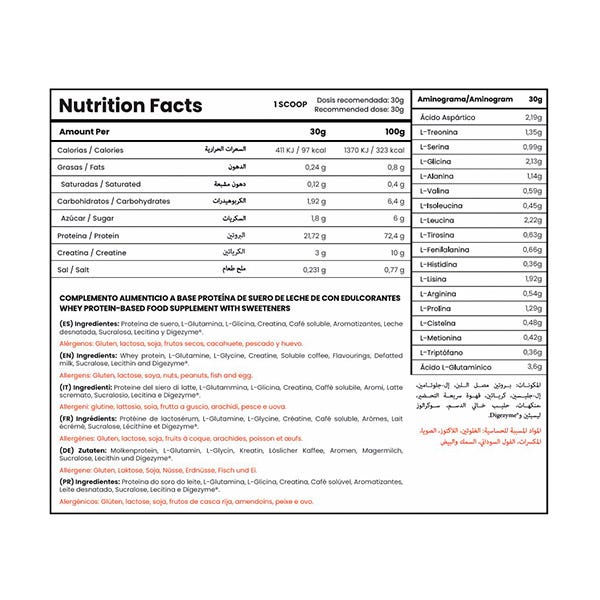 Proteína de suero, L-Glutamina, L-Glicina, Creatina, Café soluble, Aromatizantes, Leche desnatada, Sucralosa, Lecitina y Digezyme®.