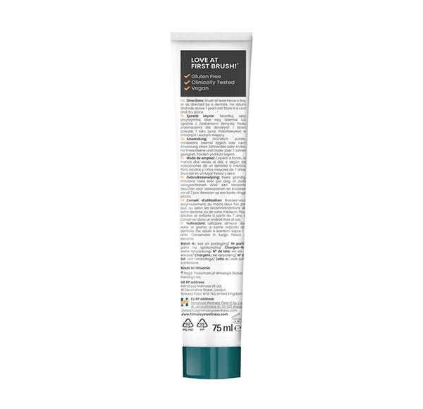 La Pasta de Dientes Blanqueadora Antiplaca Carbón Vegetal + Aceite de Semilla Negra de Himalaya Botanique, con el potente efecto blanqueador del carbón vegetal procedente de la cáscara de coco en polvo y el poder nutritivo del aceite de semilla negra, deja la boca fresca y una sonrisa más blanca en 2 semanas.