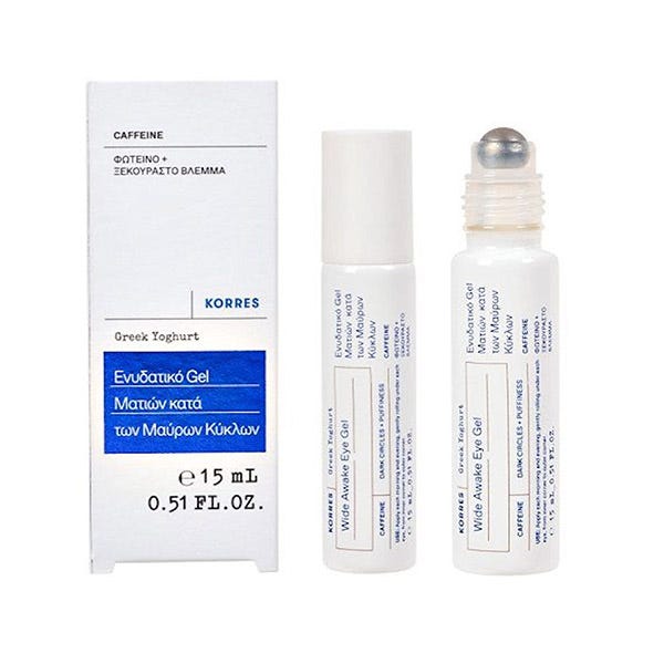 Sérum hidratante para el contorno de ojos de Yogur Griego es un gel refrescante para ojos en roll-on con yogur griego nutritivo y cafeína para una expresión sin fatiga que reduce la apariencia de ojeras y la hinchazón debajo de los ojos.