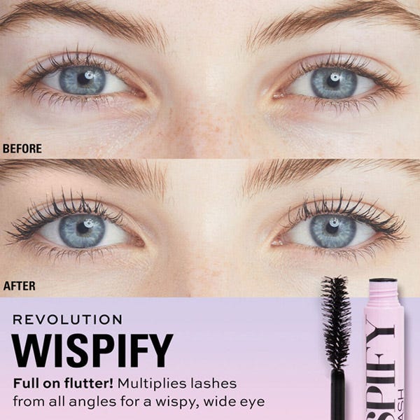 Descubre Wispify False Lash de Revolution, la máscara de pestañas que multiplicará tus pestañas desde todos los ángulos, logrando un impactante efecto de ojos abiertos.