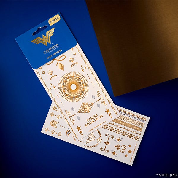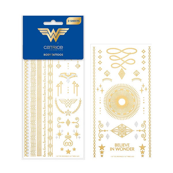 Añade un toque glamuroso a tu estilo con los tatuajes corporales Catrice Wonder Woman. Este conjunto incluye dos láminas de brillantes diseños dorados y plateados que aportan elegancia y brillo a cualquier look. Perfectos para cualquier ocasión, estos tatuajes metálicos están hechos para ser duraderos y versátiles, adecuados para colocarlos en cualquier parte del cuerpo. Aplique decorativamente un adorno fino en un dedo, el brazo o el tobillo. Los diversos motivos ponibles añaden un detalle radiante a su estilo, ya sea para un atuendo festivalero o para una elegante salida nocturna.