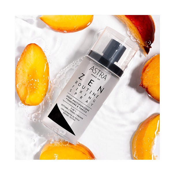 Zen Routine Fixing Spray es un spray facial capaz de prolongar la fijación del maquillaje, proporcionando una sensación de frescor extraordinario.Una nube muy ligera que difunde un intenso aroma a melocotón, inspirado en los vapores beneficiosos del hammam. La fórmula del Spray Fijador, a base de agua y sin alcohol, está enriquecida con extracto de caléndula y melocotón, con propiedades calmantes y revitalizantes, así como con agua de azahar.Un único producto para 3 funciones: primer, tónico y fijador facial. Zen Routine es la colección de Astra Make-Up dedicada al mundo del prebase: fórmulas de alto rendimiento capaces de aumentar la duración del maquillaje a través de una sensorialidad relajante y satisfactoria, organizadas en pasos rituales en un jardín zen ideal.Producto con certificación de calidad vegana